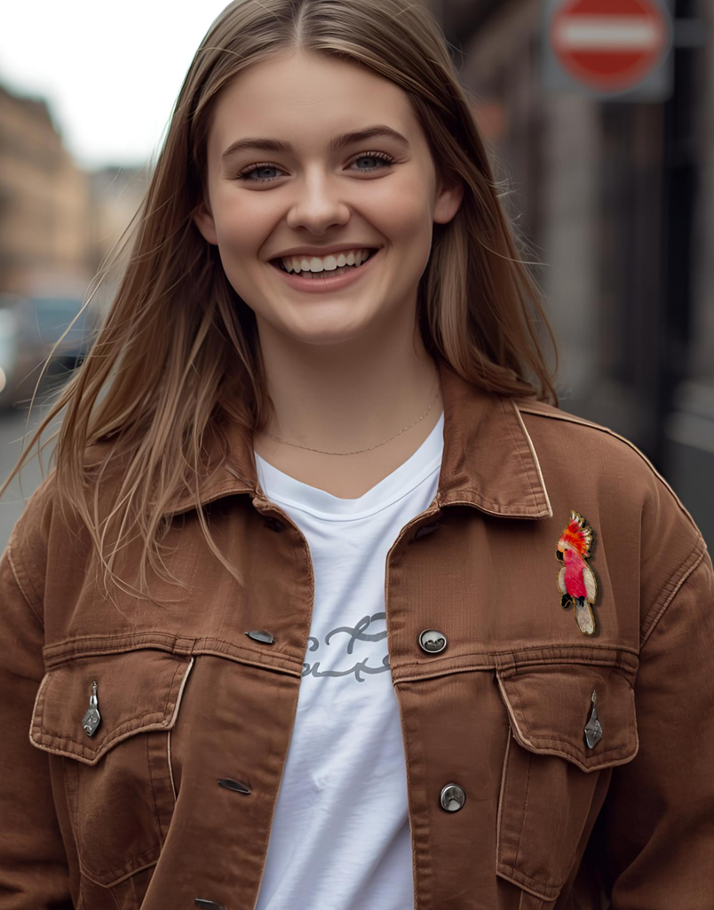 Each brooch is crafted from sustainable wood, making it an eco-friendly way to accessorise. The cockatoo features soft white, pink, coral, and yellow tones – a cheerful pop of colour that’s perfect for brightening up a jacket, bag, or scarf.