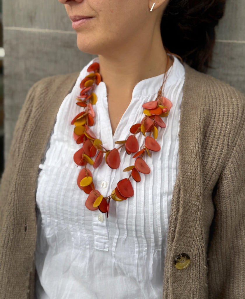 This vibrant, eco-friendly necklace handcrafted from sustainably harvested tagua nut slices, artfully shaped into small, lightweight triangular pieces. Each slice is naturally dyed in a mix of complementary colours, creating a harmonious balance that adds a playful yet elegant touch to any outfit.